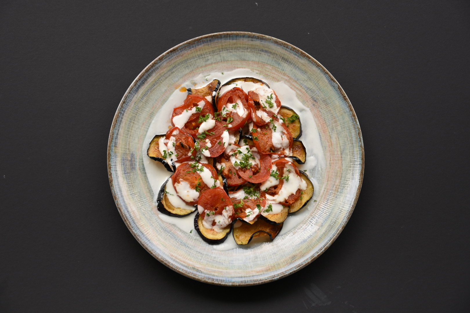 Linsen-Tomatensauce und Knoblauchjoghurt